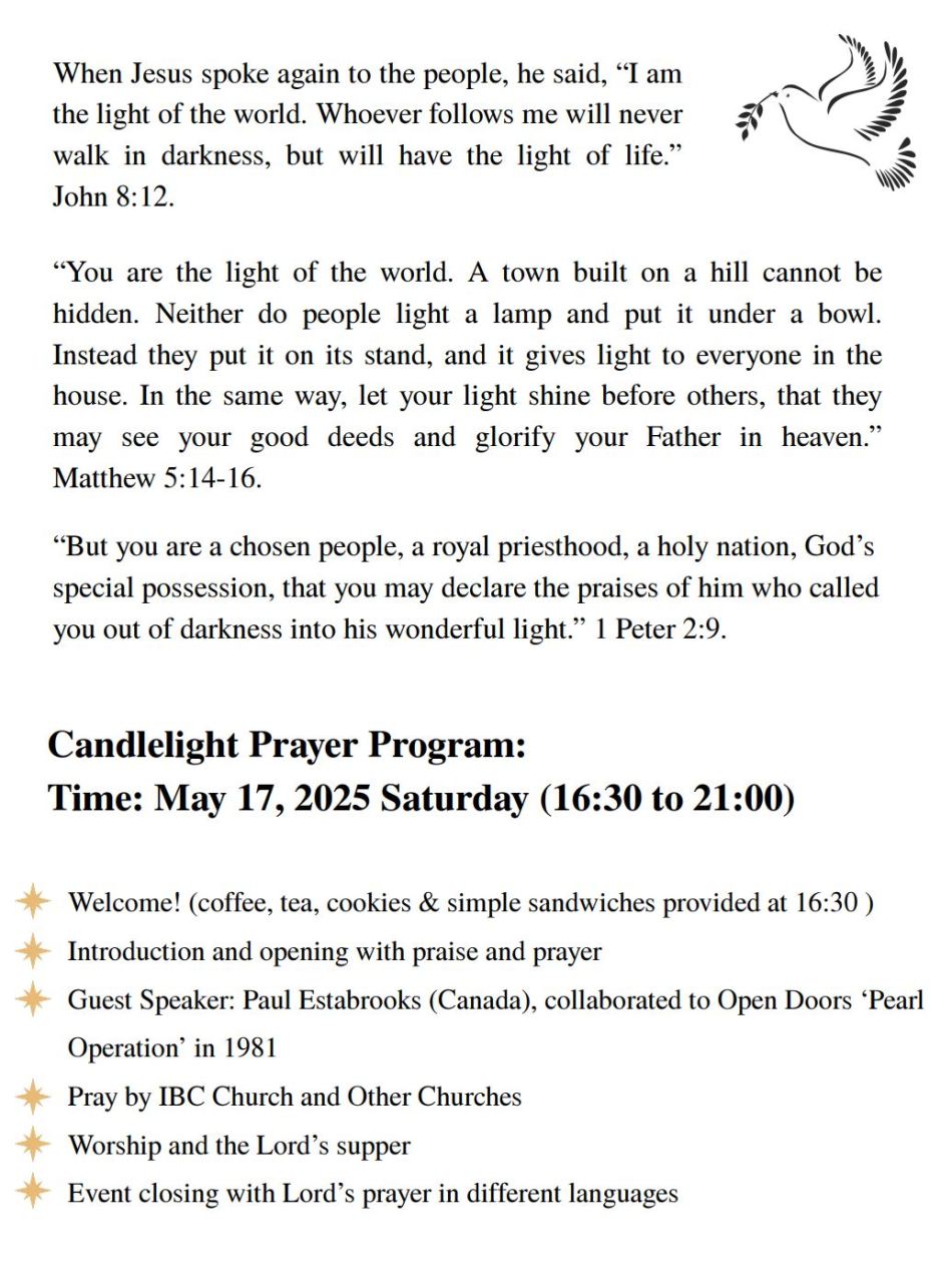 You are all invited to join us for the ‘Candlelight Prayer’ on May 17, 2025 (Saturday) from 16:30 to 21:00 in our church Worship hall.